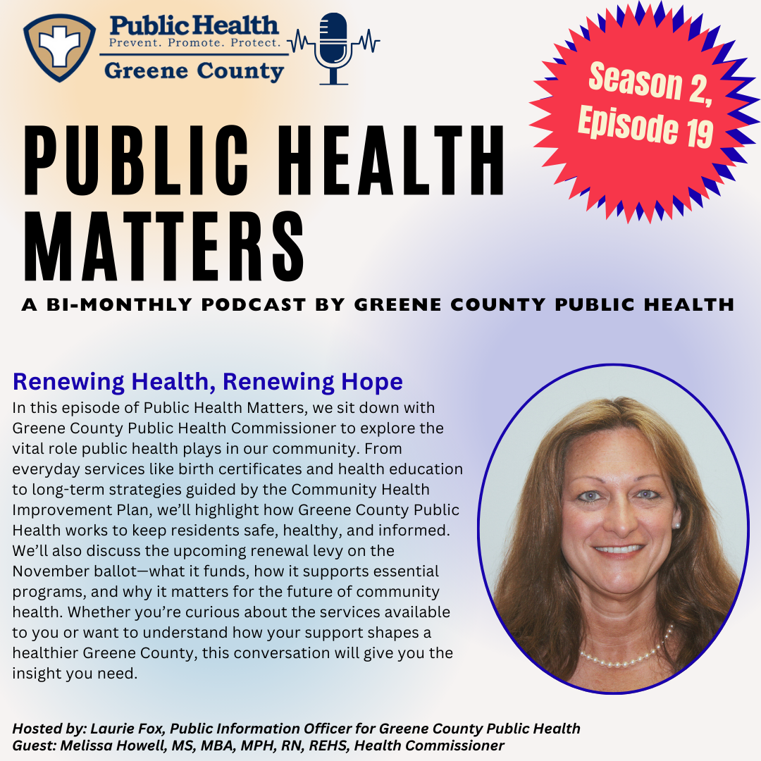 In this episode of Public Health Matters, Laurie Fox sits down with Greene County Public Health Commissioner Melissa Howell to explore the vital role public health plays in our community. From everyday services like birth certificates and health education to long-term strategies guided by the Community Health Improvement Plan, we’ll highlight how Greene County Public Health works to keep residents safe, healthy, and informed. We’ll also discuss the upcoming renewal levy on the November ballot—what it funds, how it supports essential programs, and why it matters for the future of community health. Whether you’re curious about the services available to you or want to understand how your support shapes a healthier Greene County, this conversation will give you the insight you need.