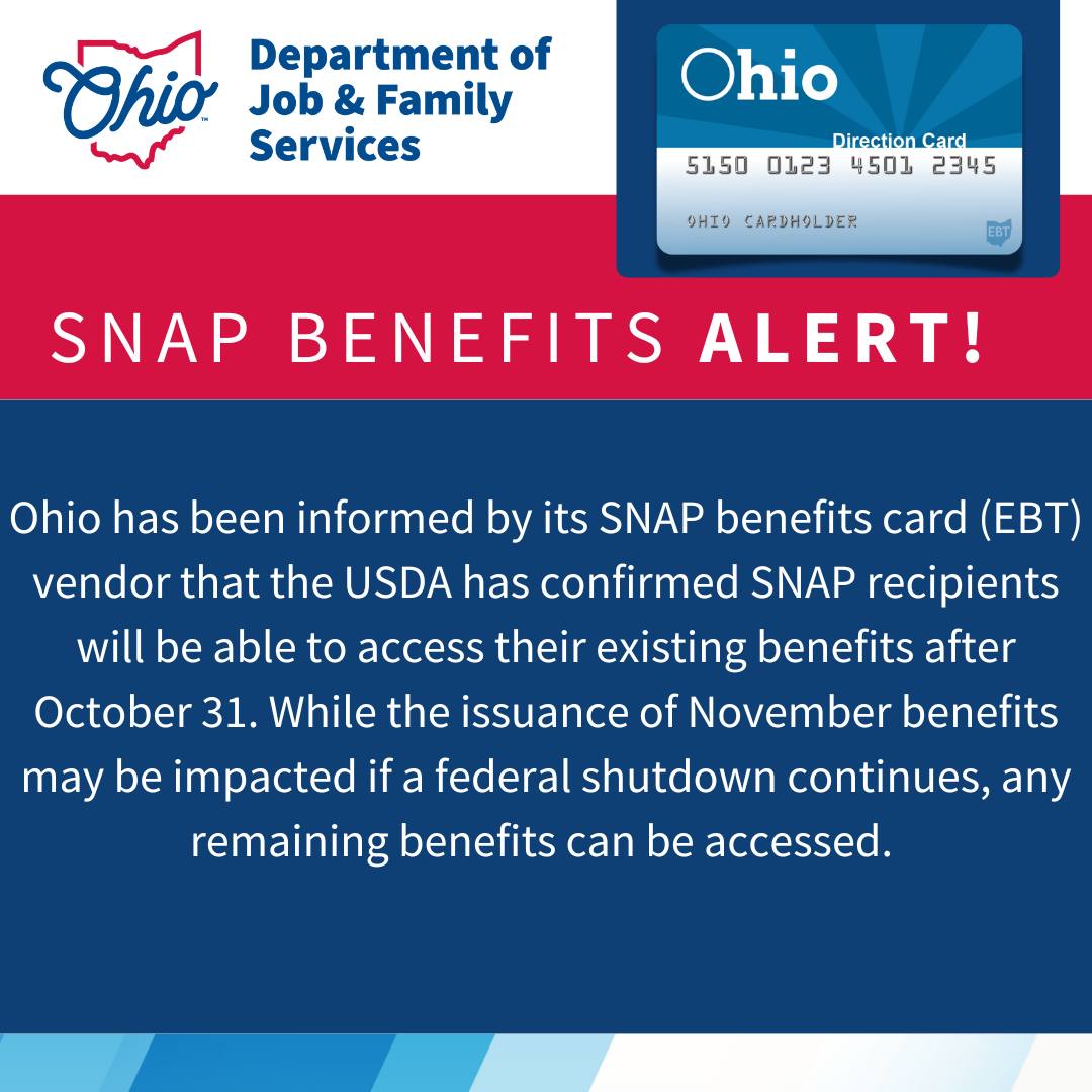Ohio has been informed by its SNAP benefits card (EBT) vendor that the USDA has confirmed SNAP recipients will be able to access their existing benefits after October 31. While the issuance of November benefits may be impacted if a federal shutdown continues, any remaining benefits can be accessed.
