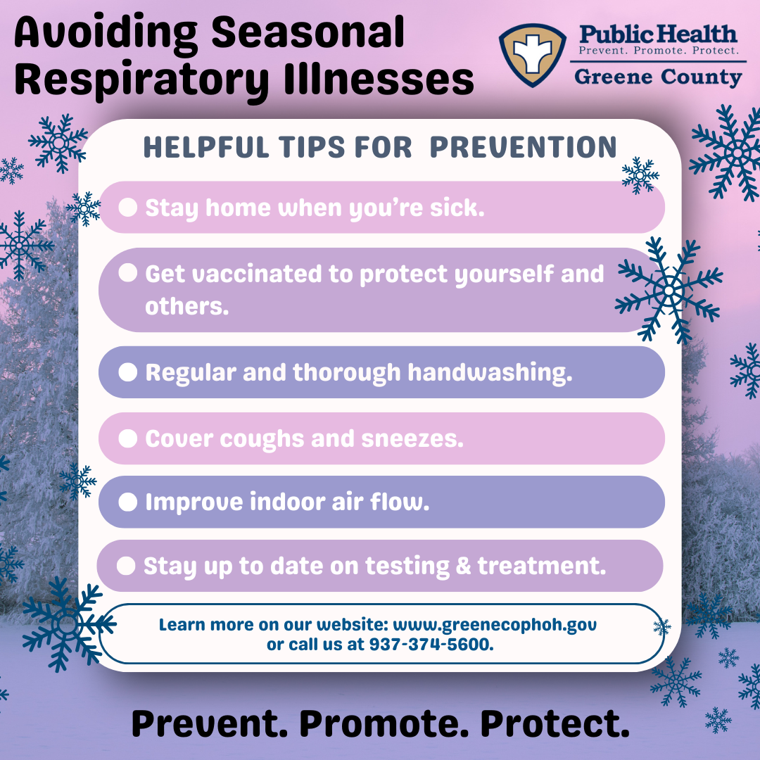 XENIA, OHIO – Greene County Public Health (GCPH) is encouraging residents to stay up to date on recommended vaccinations to protect against COVID-19, influenza, and respiratory syncytial virus (RSV) during the winter respiratory virus season.