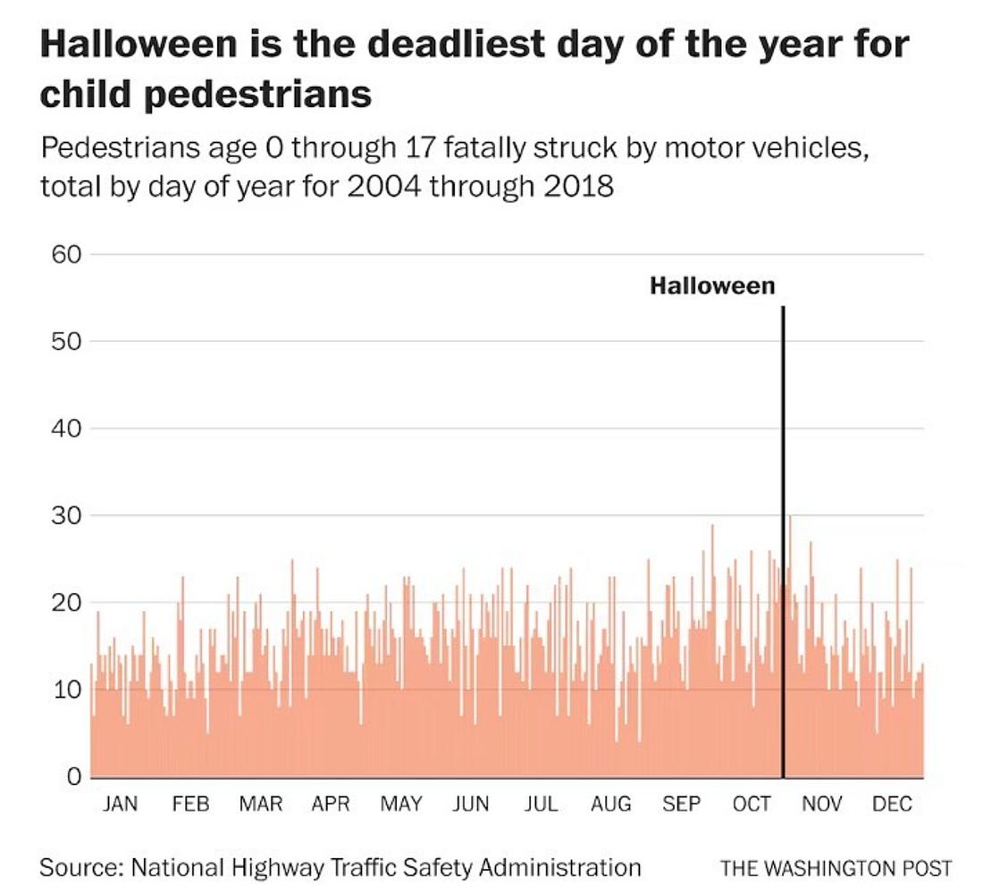 The biggest and most unusual spike we see around Halloween is in pedestrian accidents, particularly child pedestrian deaths, which consistently rise on this day, even though they remain rare.