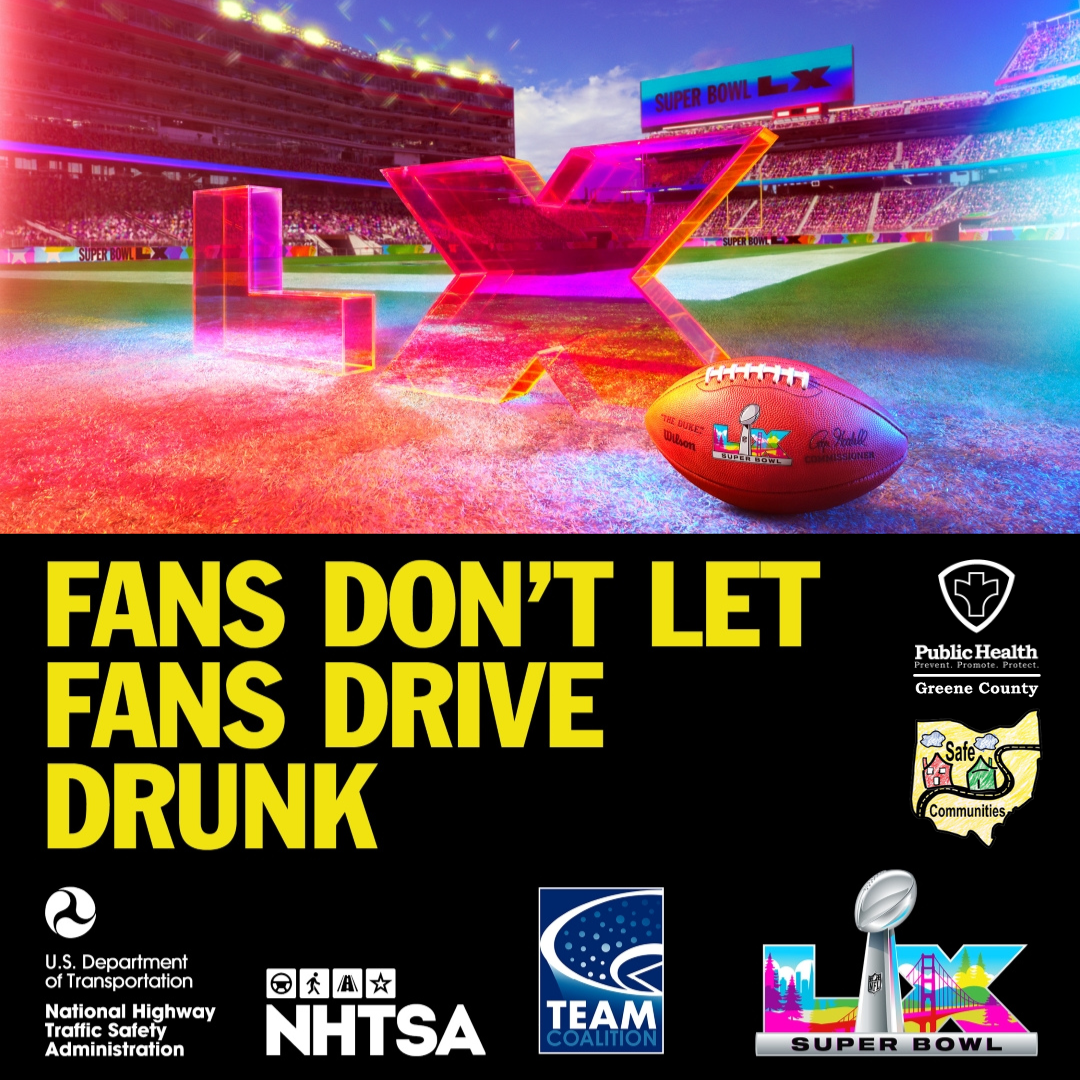 XENIA, OH -- For Super Bowl LX on Sunday, February 8, 2026, the U.S. Department of Transportation’s National Highway Traffic Safety Administration and Greene County Public Health’s Safe Communities Coalition are teaming up to remind drivers: Fans Don’t Let Fans Drive Drunk. Anyone planning to attend a Super Bowl LX party should either arrange a designated driver or avoid drinking. People hosting a party should prepare plenty of food and non-alcoholic drinks for guests, especially for designated drivers. The designated driver is the night’s real MVP and should keep that commitment from kickoff until the game ends.