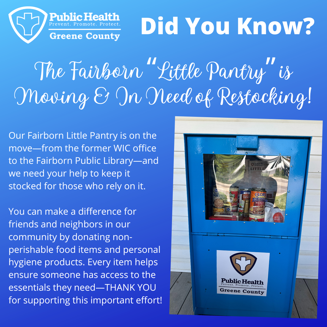 Greene County Public Health officials have announced that Fairborn’s “Little Pantry”, currently located at the former WIC office in Fairborn, will officially move to the Fairborn Library on Friday, April 14, 2026. The Little Pantry’s new address will be 1 East Main Street in Fairborn.